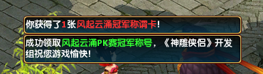 2025年9月25日(周四)更新后,风起云涌服务器第二届战队PK赛69/89/109等级段冠军战队的玩家,可前往临安城【神雕】处领取专属冠军称号。