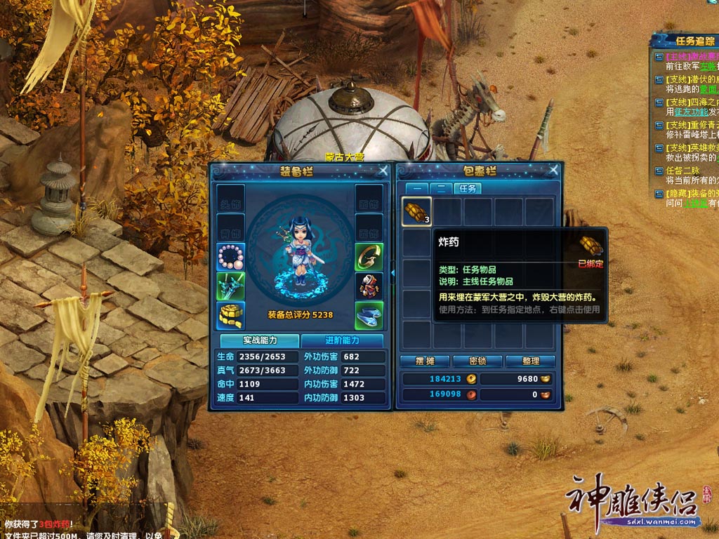 黄蓉见你行事果断颇有侠风,便将研制好的炸药包交给你,嘱咐你将它们掩埋在蛮兵大帐之下。虽然掩埋的最后不小心暴露行踪,但好在你打败了巡逻兵,迅速地回去向郭靖复命。郭靖将启爆器交给你引发炸弹,只等那惊天一响,大军将冲出城门,与蛮兵决一死战。