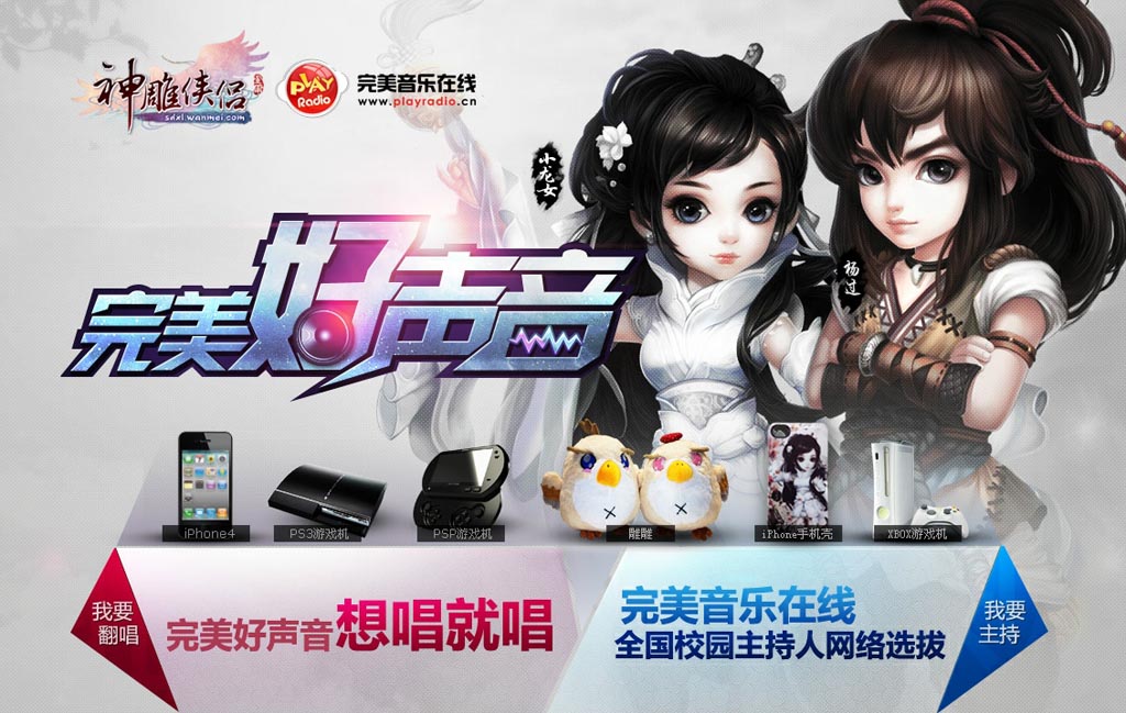 本次“完美好声音”主题活动分为校园主持人网络选拔赛,以及《神雕侠侣》游戏主题歌翻唱大赛。参与主持人选拔赛的同学请将能够展现自己的视频文件上传于视频网站(优酷、土豆等),并将链接复制于活动主页的报名相应位置;参与翻唱大赛的同学,请将作品发送至官方邮箱sdxlhd@wanmei.com,优秀的作品将有机会在完美电台打榜宣传,前三名更有机会参加北京校园现场PK大赛!